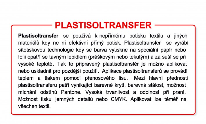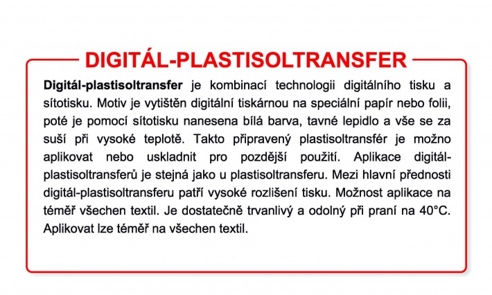 Tisk DTF je moderní transferový proces pro plnobarevný potisk textilu. Výsledkem je vysoce kvalitní, detailní a trvanlivý tisk, který je vhodný pro vhodný pro širokou škálu materiálů a aplikací. Motiv se tiskne na speciální PET fólii, která je opatřena lepicí vrstvou. Výhody tisku DTF: Technologie DTF umožňuje tisk s vysokým rozlišením a detailními motivy. Potisk je odolný vůči praní, oděru a blednutí. Tisk DTF je vhodný pro tisk na širokou škálu textilií, včetně bavlny, polyesteru, směsové tkaniny a další. Tisk DTF nabízí jasné a syté barvy při plnobarevném tisku. Tisk DTF je moderní a efektivní technologie, která nabízí širokou škálu možností. Potisk textilu s vysokou kvalitou, trvanlivostí a flexibilitou. Nevýhodou tisku DTF je, že nedokáže reprodukovat přesný odstín přímých barev, jako např. Pantone a podobně.